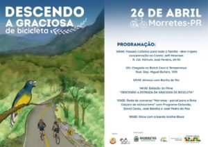 À tarde, a programação continua com a exibição do filme “Descendo a Estrada da Graciosa de Bicicleta”, seguido da roda de conversa “Morretes – portal para a Rota Caiçara de cicloturismo”, com representantes do Programa Ciclovida UFPR, David Couto, José Belotto e José Pedro da Ros. O encerramento será com a apresentação musical da banda Gralha Blues.